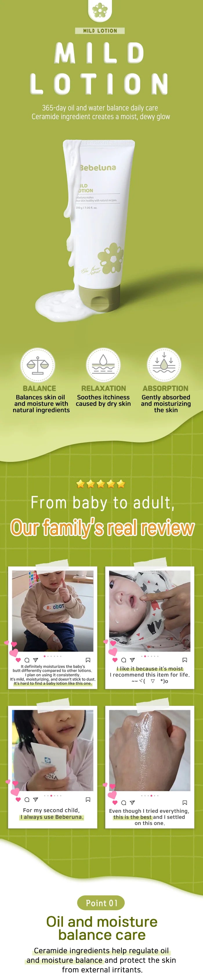 Bebeluna Mild Lotion: the only moisturizer you'll need all four seasons. Balances skin's oil and moisture, plus provides Temporary Relief of Itching due to Dry Skin.