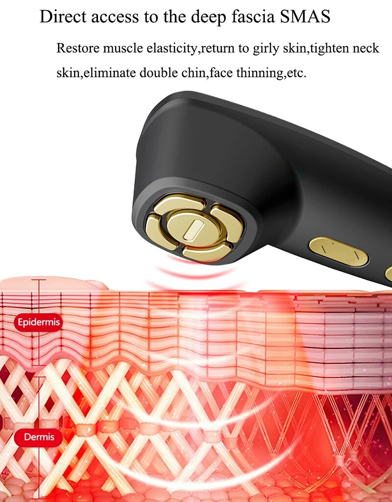 HIFU (High Intensity Focused Ultrasound) owns the non-invasive and focused penetrating advantage. By HIFU technology, it can use the non-invasive way (without surgery or injection) to act on designated subcutaneous area. The subcutaneous tissue will produce transient heating under high-frequency vibration, to up to the treatment energy which makes the skin tissues cells regrown.